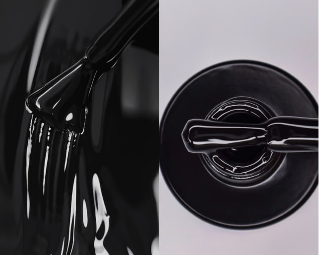 Глубокий, чистый, абсолютно нейтральный чёрный — ни капли синевы, ни намёка на коричневый подтон. Он не холодный и не тёплый, а именно тот идеальный «нулевой» чёрный, который так сложно найти. Его плотность поражает: достаточно одного слоя для насыщенного покрытия без серости и полос, хотя на длинных ногтях мастеру, возможно, захочется сделать два тонких слоя — исключительно ради идеала.