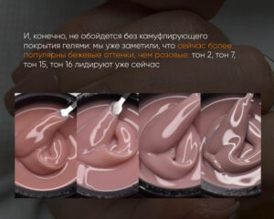 Нюд в эстетике frugal chic остаётся фундаментом. И мы уже видим, как бежевые камуфлирующие гели уверенно выходят в лидеры продаж, постепенно обгоняя розовую палитру. Особенно востребованы: