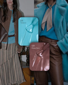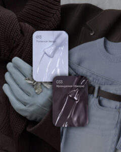 Здесь все работает как в природе: холодный, насыщенный Лед идеально раскрывается в градиенте с шоколадным камуфляжем тон 16, который при этом совершенно не уходит в тепло и остается холодным, почти каменным. За счет этого сочетание выглядит максимально гармонично и естественно, словно море и горы, существующие вместе вне времени и моды.