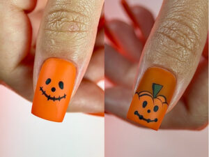 Если хочется чего-то тематического, просто покрасьте ногти однотоном в гель-лаке №019 Мандариновый, а затем тонкой кистью и чёрным гель-лаком нарисуйте знаменитое “лицо Джека”. Завершите дизайн матовым топом и получите идеально атмосферный маникюр в духе Хэллоуина: дерзкий, забавный и с лёгкой загадкой.