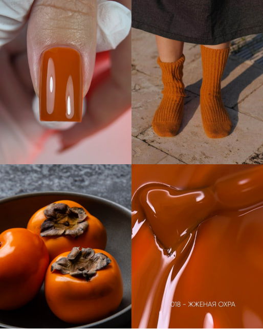 Текстура плотная, как растопленное сливочное масло, гель-лак легко распределяется по ногтю, не затекает и полностью перекрывает поверхность с первого слоя. Обожжённая охра — это оранжевый, который звучит тихо, но уверенно, как дорогая замша или пряный аромат корицы.